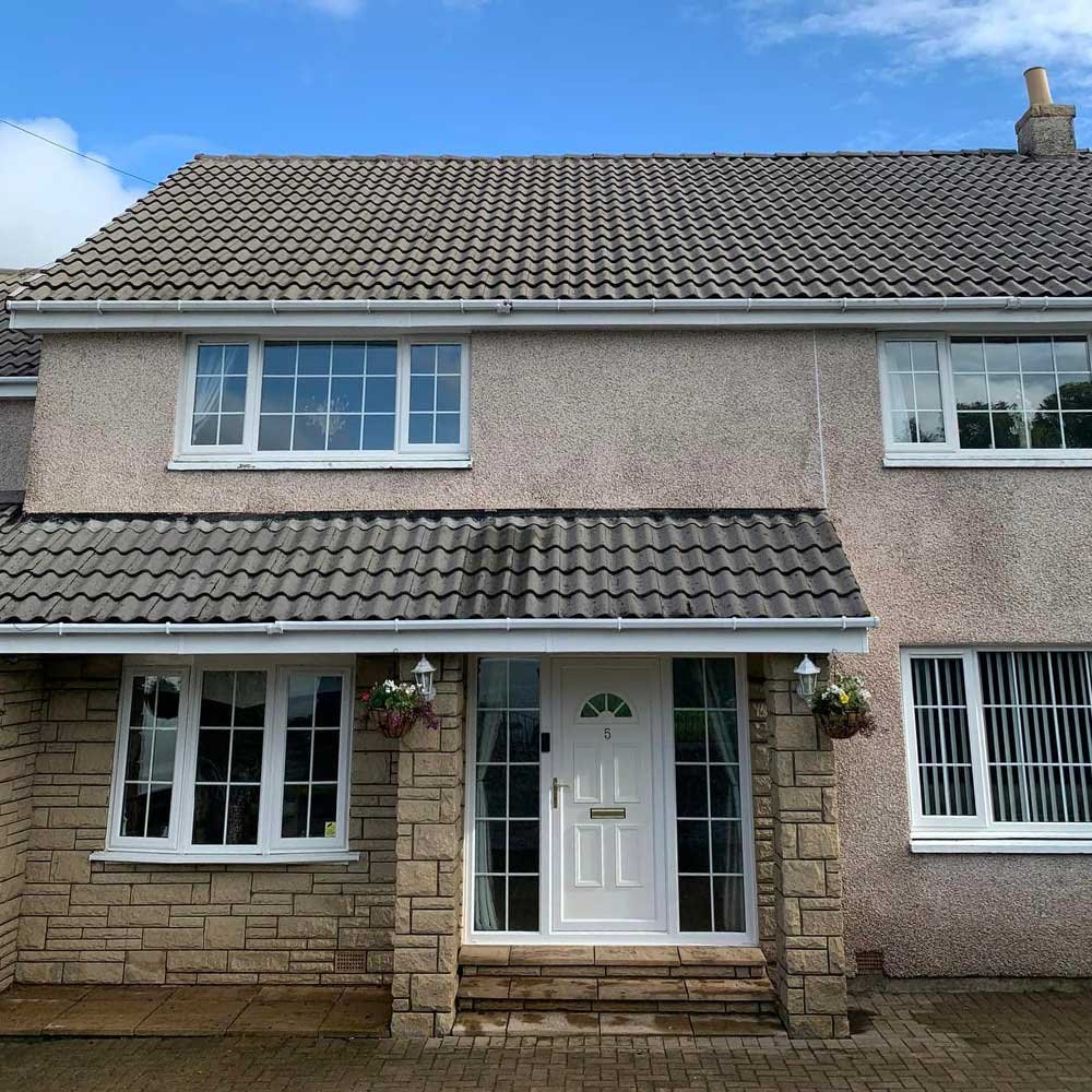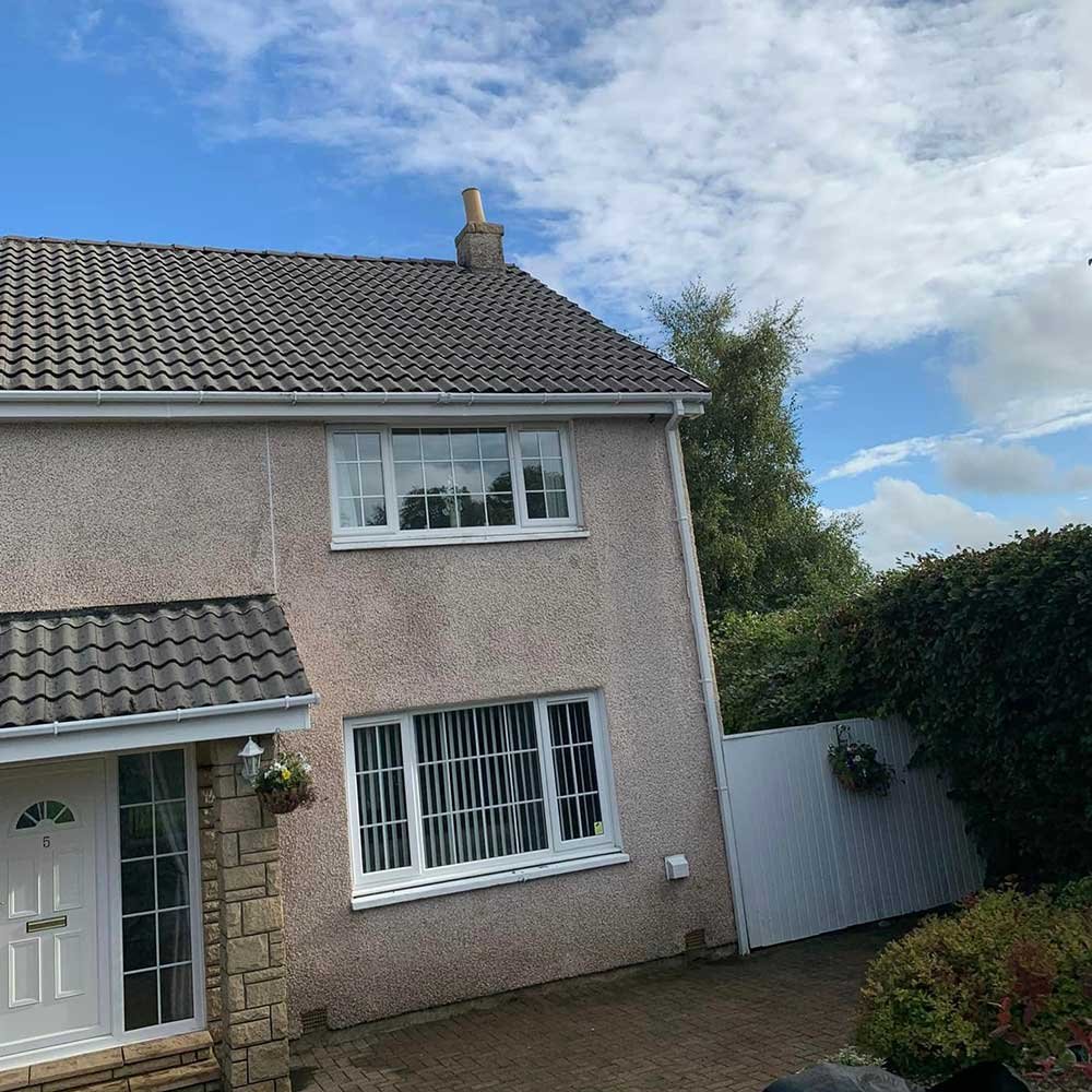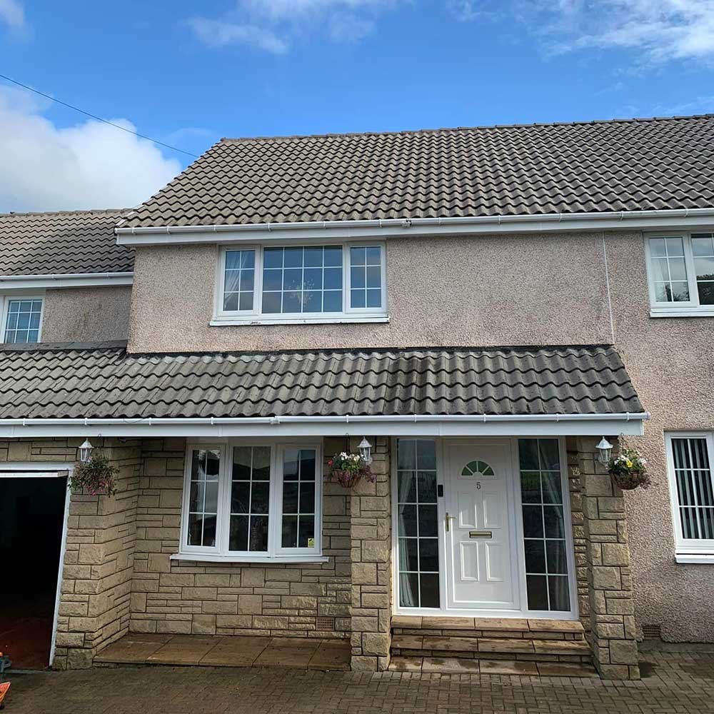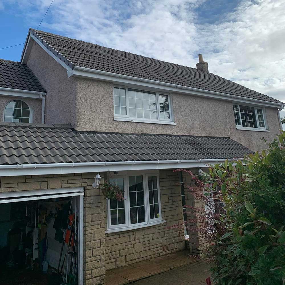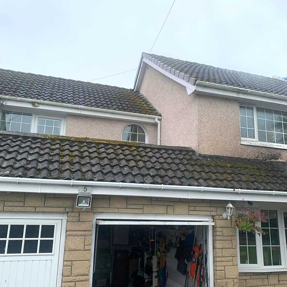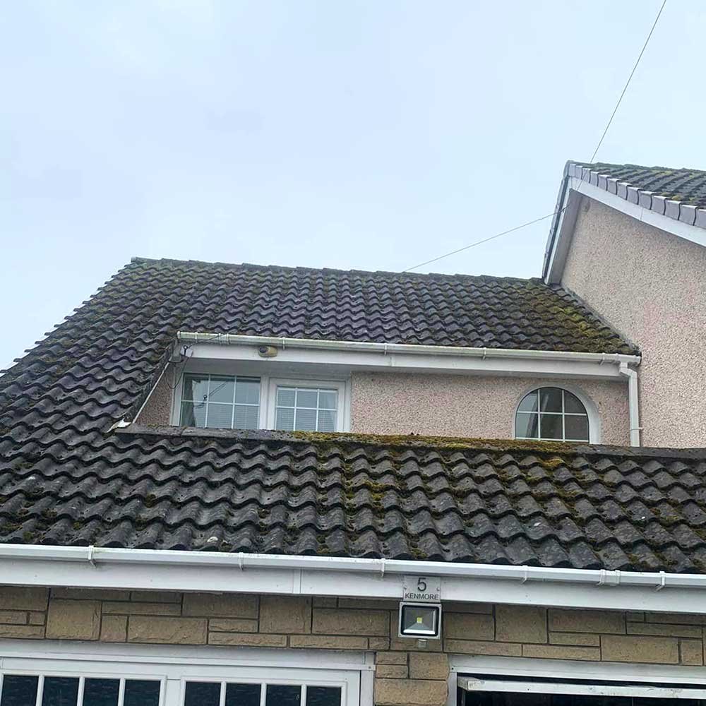We conducted a thorough roof cleaning for a 5-bedroom residence using high-pressure washing and a biocide solution, effectively removing lichen and dark stains while preventing future growth.