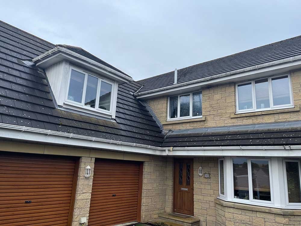 We cleaned the roof of a large 5-bedroom home using high-powered pressure washing and a biocide treatment to remove dirt, moss, and algae, while also preventing future growth.